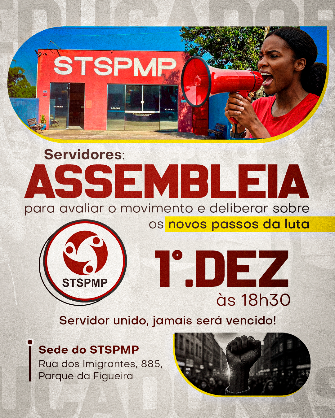 O STSPMP convoca todos para assembleia na próxima segunda, 1º de dezembro de 2025 na sede do Sindicato (rua dos Imigrantes, 885, Parque da Figueira), às 18h30 (2ª chamada). O encontro visa vamos avaliar o movimento e deliberar sobre os novos passos da luta. Em um momento de estado de greve da categoria, a participação maciça é fundamental para fortalecer a representatividade e assegurar que as vozes dos trabalhadores sejam ouvidas.