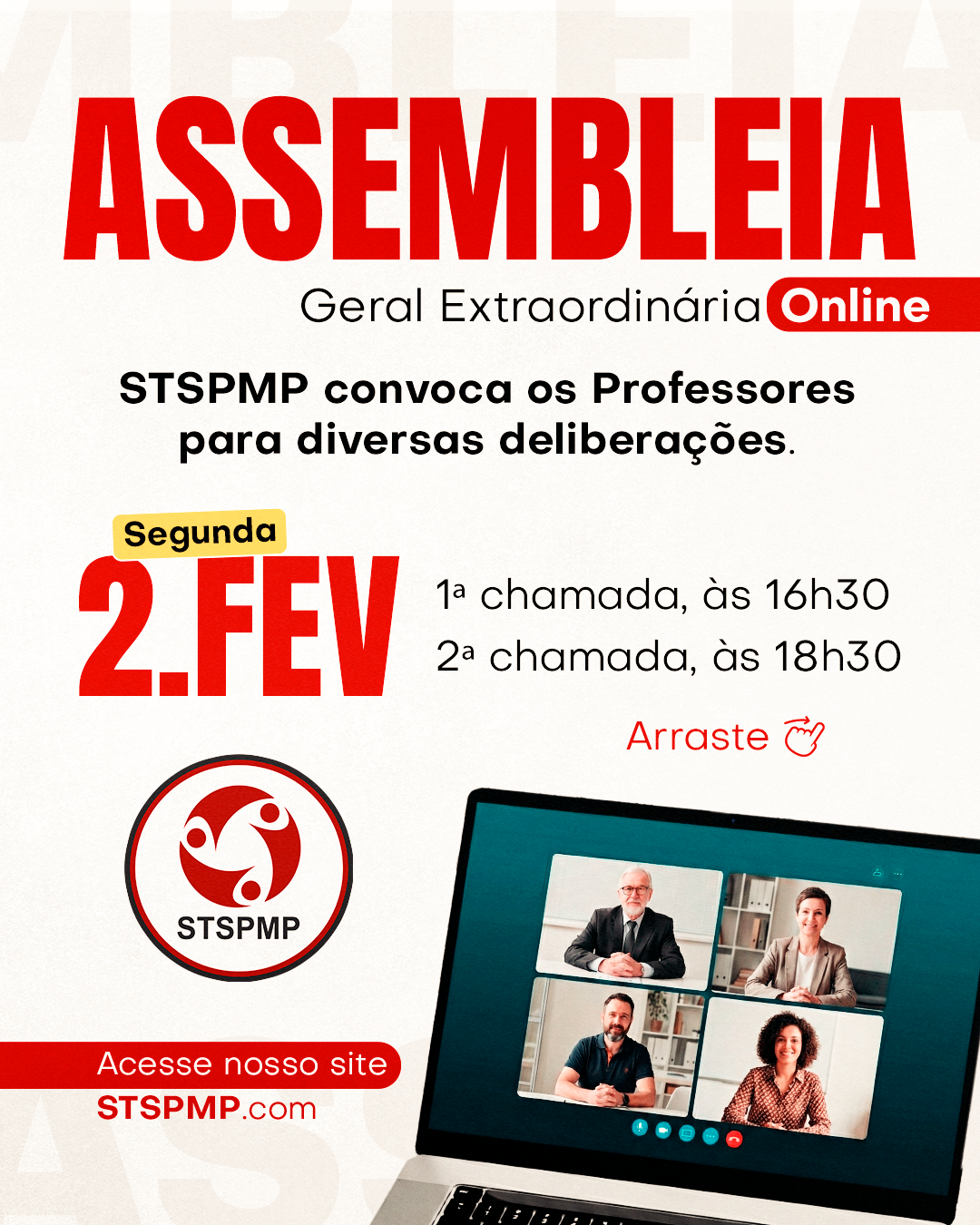 Assembleia ONLINE do STSPMP com os Professores será segunda, dia 2 de de fevereiro, às 18h30. Serão diversas deliberações. Participem!