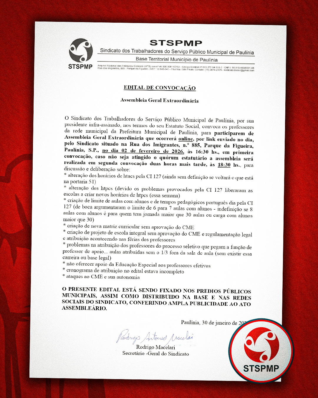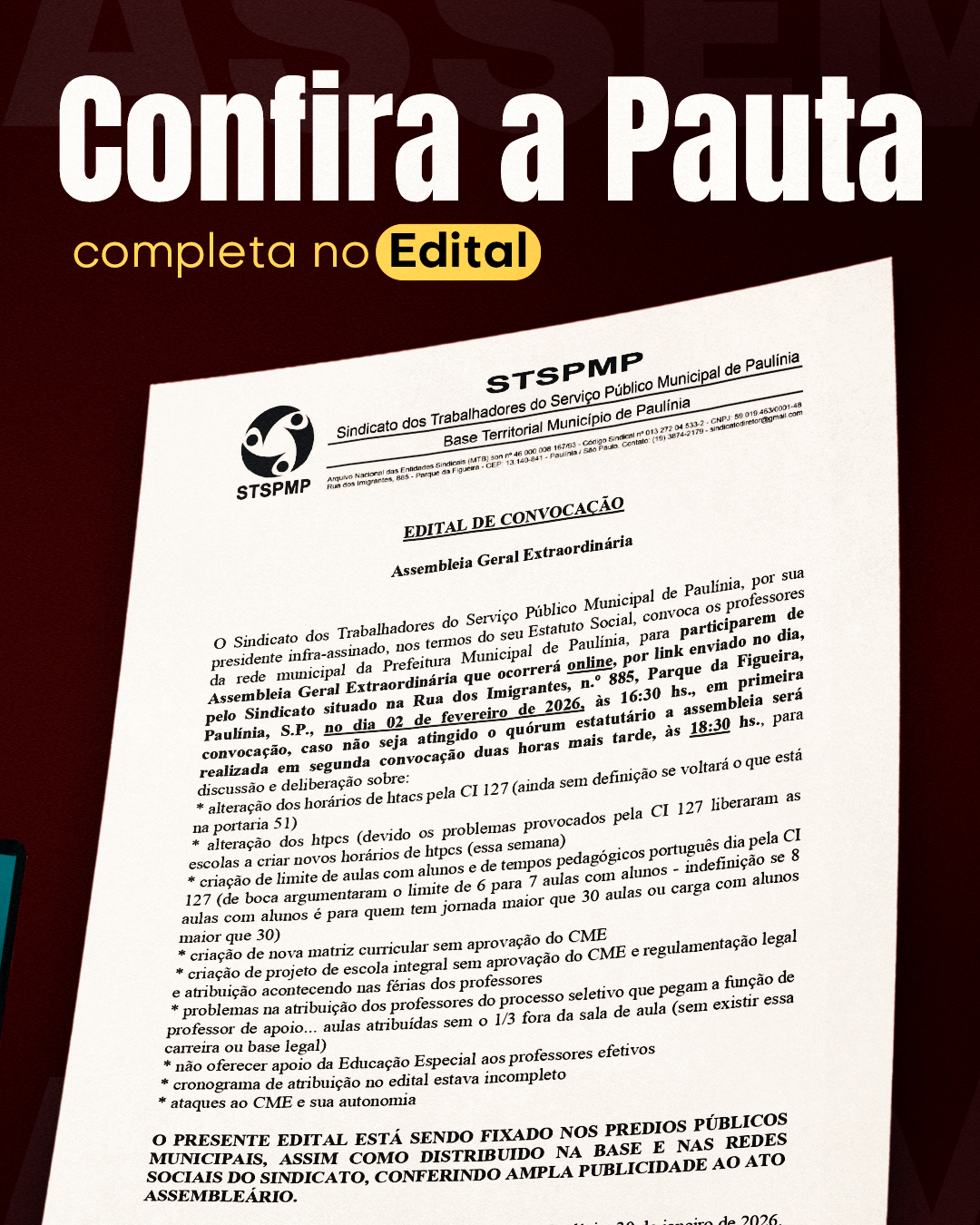 O Sindicato dos Trabalhadores do Serviço Público Municipal de Paulínia, por sua presidente infra-assinado, nos termos do seu Estatuto Social, convoca os professores da rede municipal da Prefeitura Municipal de Paulínia, para participarem de Assembleia Geral Extraordinária que ocorrerá online, por link enviado no dia, pelo Sindicato situado na Rua dos Imigrantes, n.º 885, Parque da Figueira, Paulínia, S.P., no dia 02 de fevereiro de 2026, às 16:30 hs., em primeira convocação, caso não seja atingido o quórum estatutário a assembleia será realizada em segunda convocação duas horas mais tarde, às 18:30 hs., para discussão e deliberação sobre: