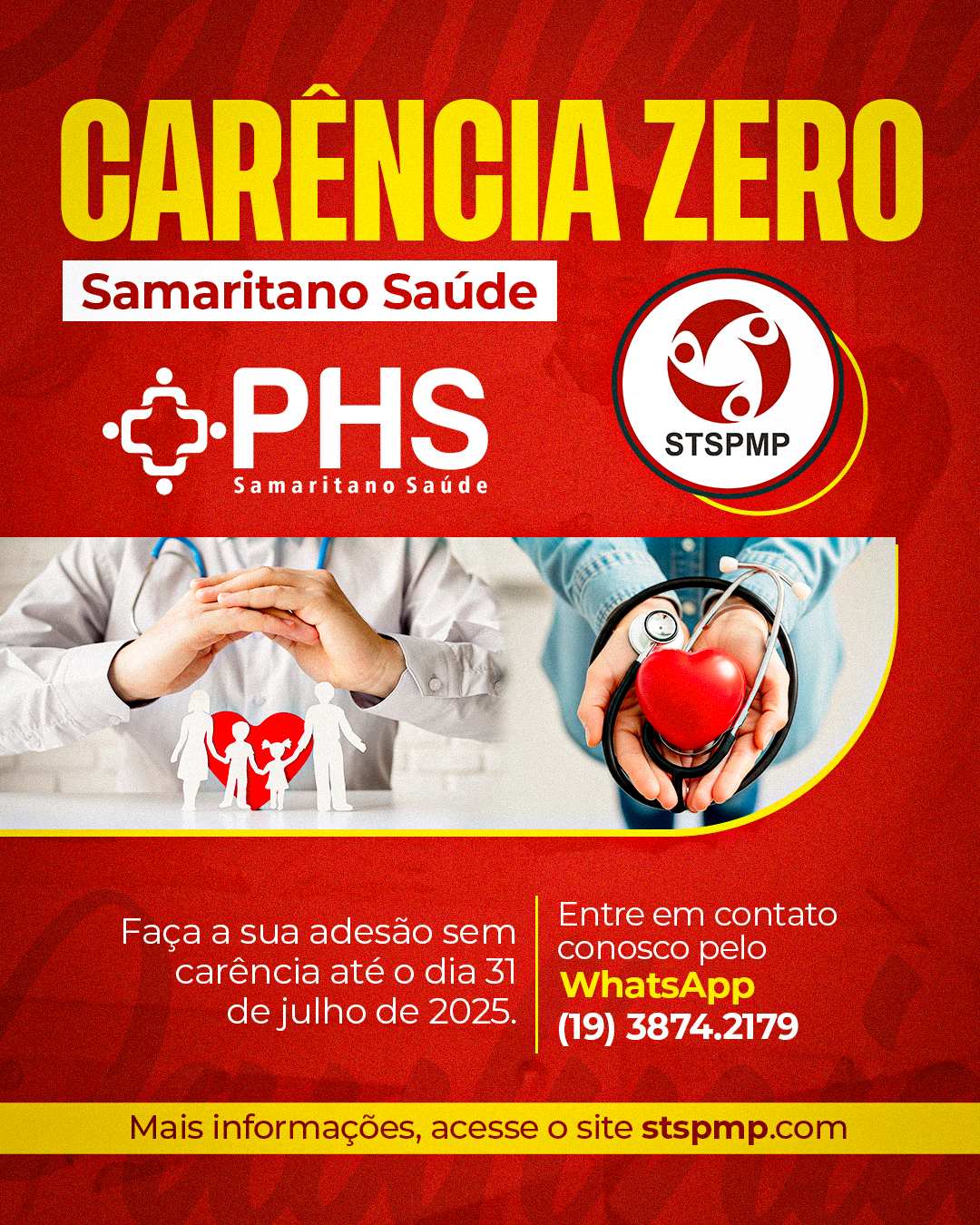 O Sindicato tem uma excelente notícia aos seus associados. Os Servidores que aderirem ao convênio Samaritano de 1º de julho até dia 30 de julho de 2025 terão direito à CARÊNCIA ZERO*. É isso mesmo! Oportunidade única para você garantir um dos melhores planos de saúde da região metropolitana de Campinas. Aproveite esta promoção especial e faça já sua adesão – você pode, desde agora, ficar na nossa lista de espera e ter o plano efetivado no período promocional.