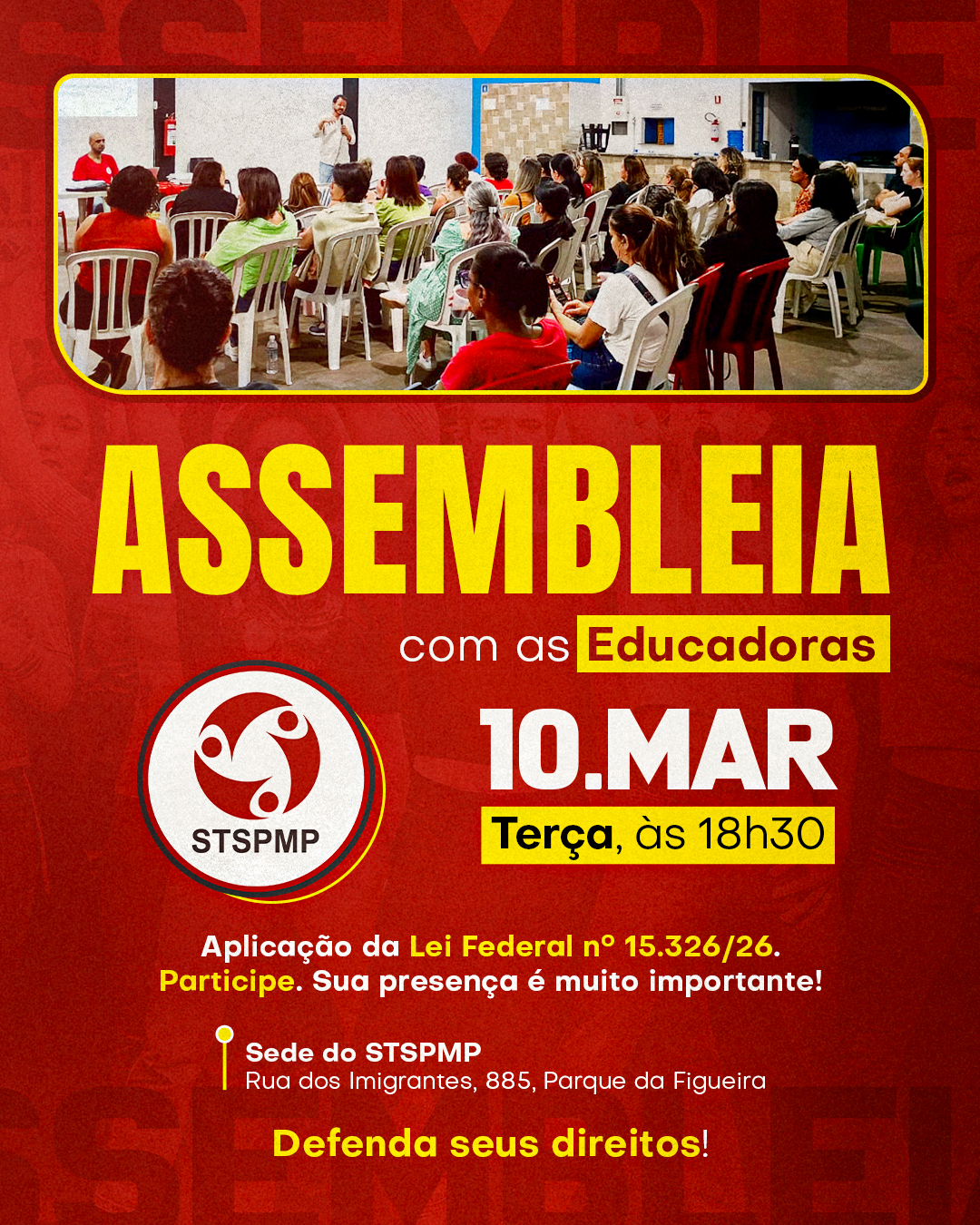O STSPMP convoca as Educadoras de Paulínia para comparecerem a uma importante assembleia na terça, dia 10 de março, às 18h30, na sede do Sindicato (rua dos Imigrantes, nº 885, Parque da Figueira, Paulínia). A participação das companheiras é indispensável, pois deliberaremos sobre a Lei Federal nº 15.326/2026, sancionada em janeiro, que garante às Educadoras Infantis a equiparação como parte da classe Docente no Quadro do Magistério.