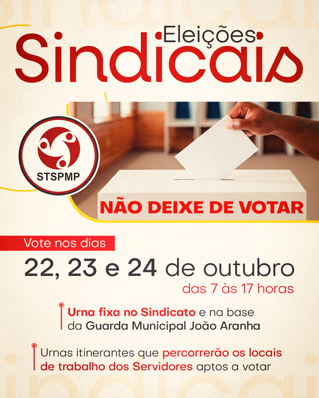 O STSPMP convoca os associados para as eleições sindicais. Nos dias 22, 23 e 24 de outubro de 2025, os Servidores vão votar no pleito para escolha da nova diretoria da entidade sindical. O voto poderá ser registrado na sede do Sindicato – rua dos Imigrantes, 885, Parque da Figueira, Guarda Civil Municipal Base João Aranha – Praça Waldemar Perissinotto, Jardim Ibirapuera, ou através das urnas itinerantes nos postos de trabalho, das 7 às 17 horas.