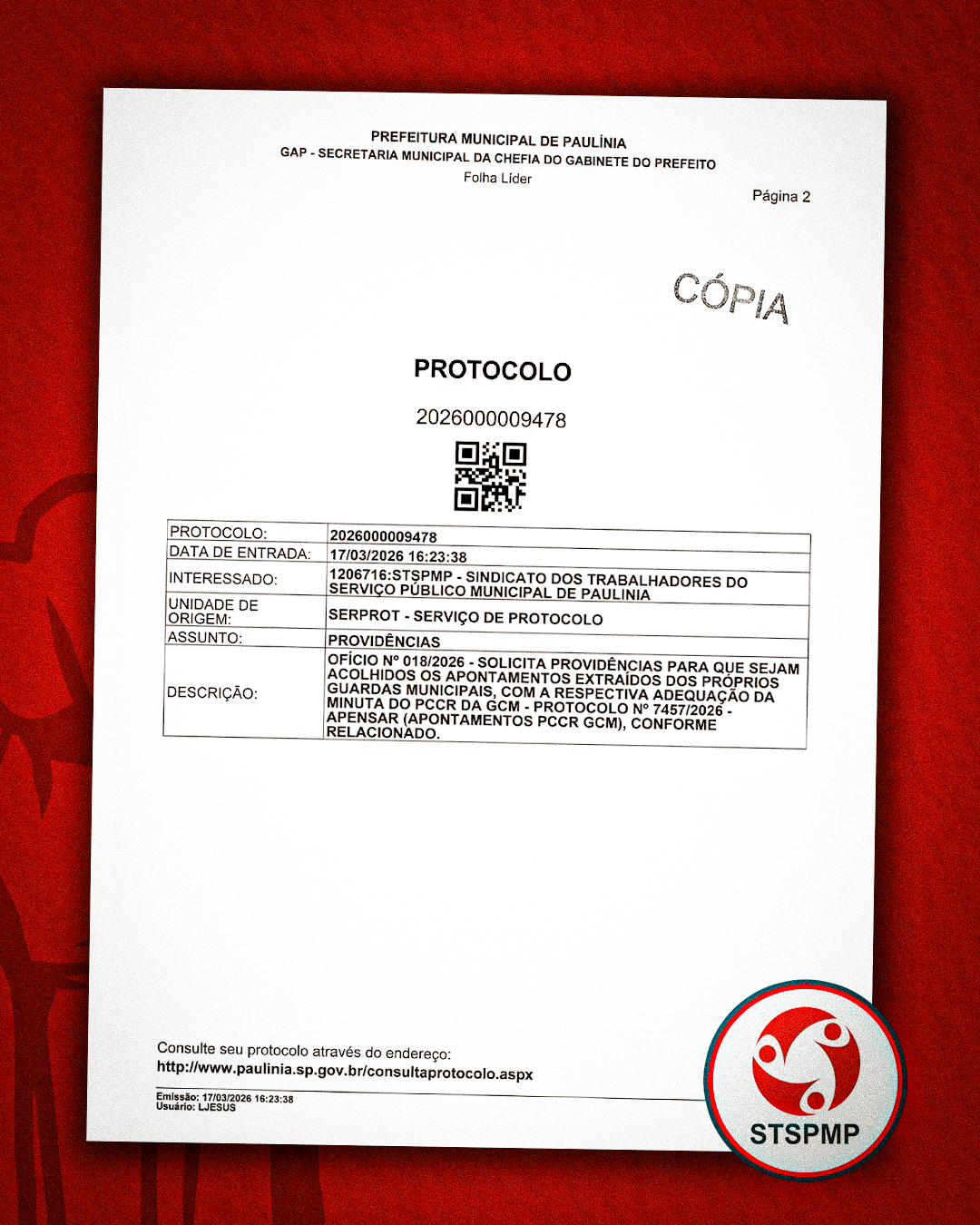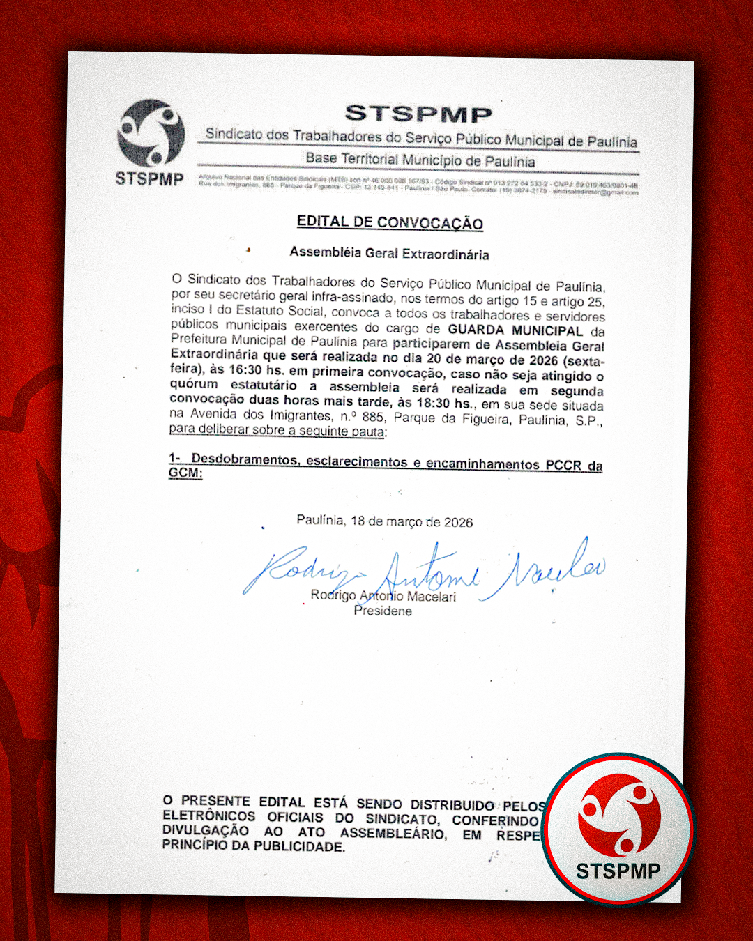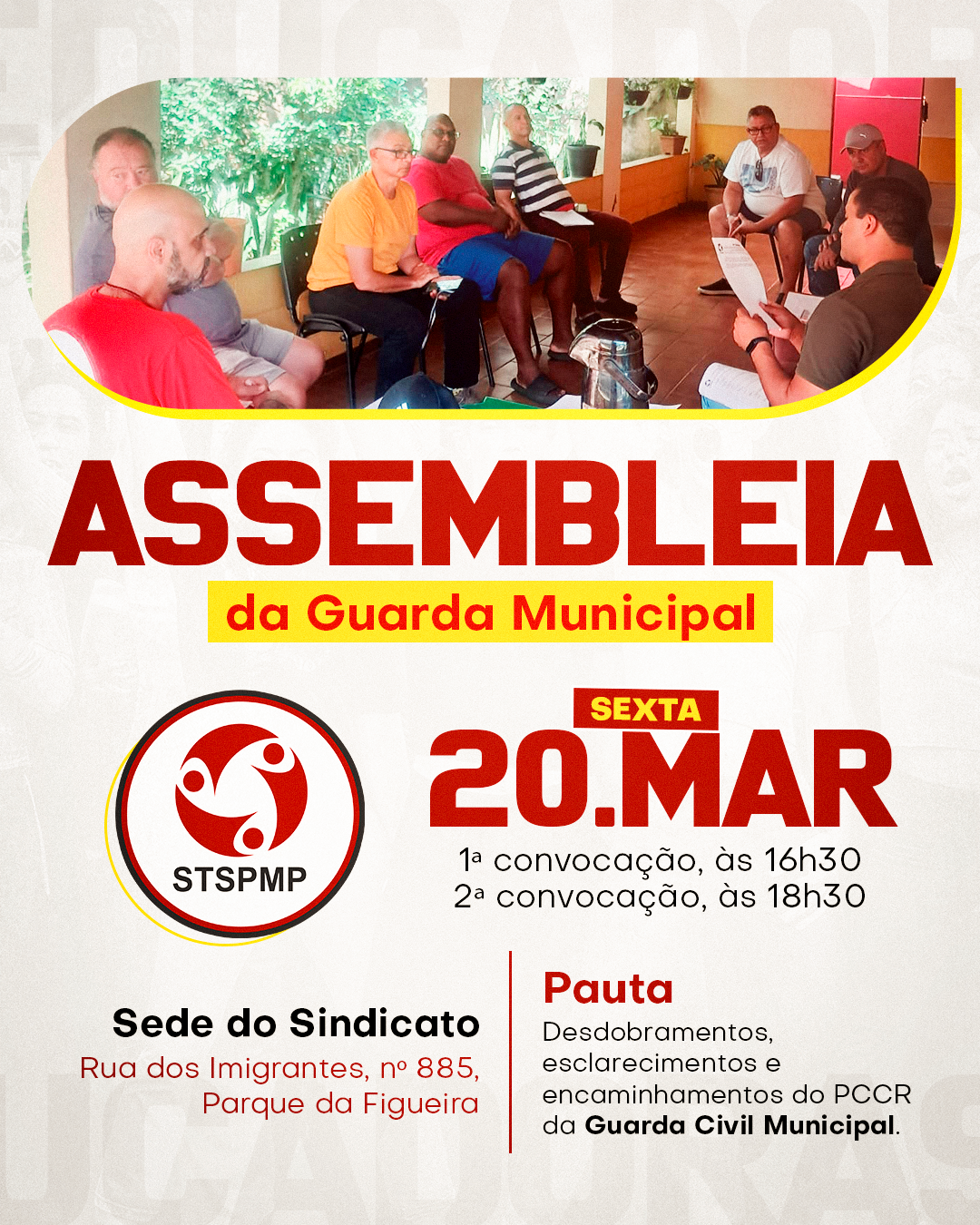 O STSPMP realiza na próxima sexta, dia 20 de março, assembleia com a Guarda Municipal. Será em nossa sede (avenida dos Imigrantes, 885, Parque da Figueira), com 1ª convocação, às 16h30; e 2ª convocação, às 18h30. Será oportunidade de tratarmos sobre os desdobramentos, esclarecimentos e encaminhamentos do Plano de Cargos, Carreiras e Remuneração (PCCR) da categoria.