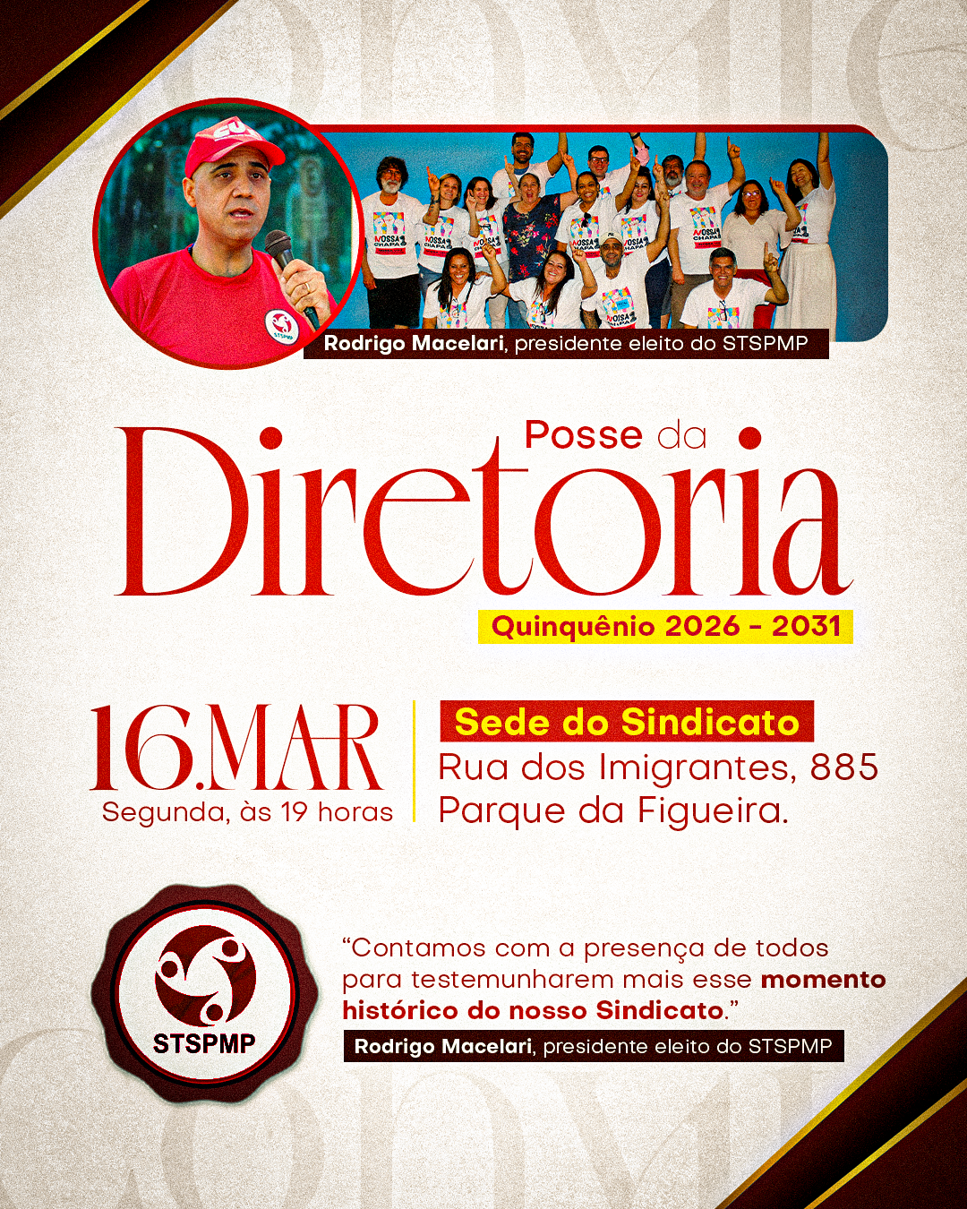 Posse da nova diretoria do STSPMP será aberta a todos os Servidores. Participem dia 16 de março, às 19 horas, na sede