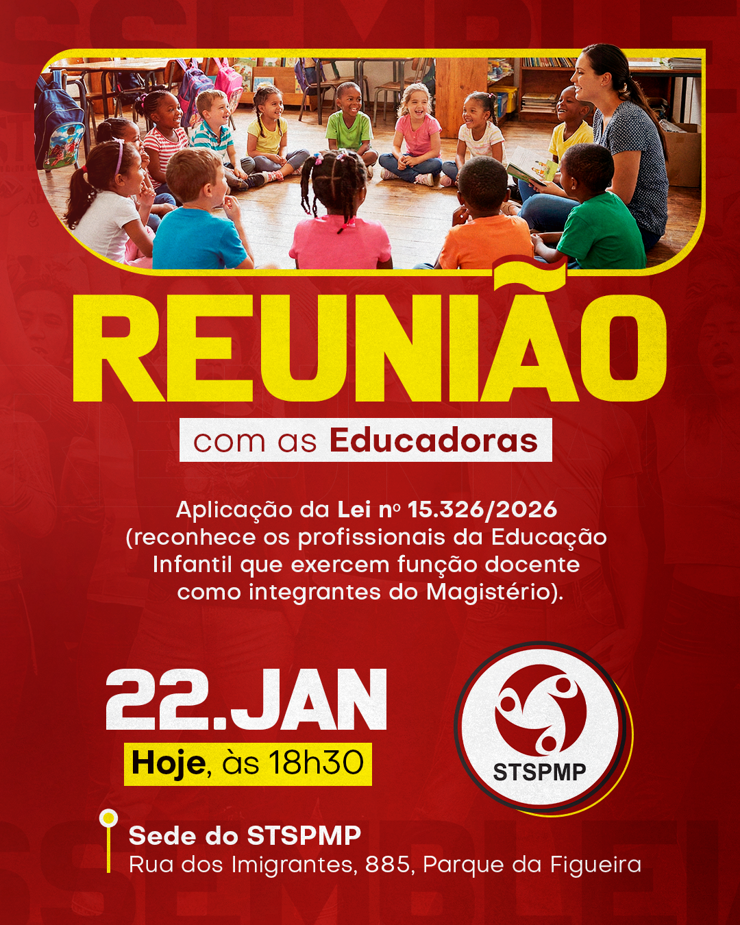 Reunião com os Professores da Educação Infantil sobre a aplicação da Lei nº 15.326/2026 será nesta quinta, 22/1, às 18h30, no STSPMP