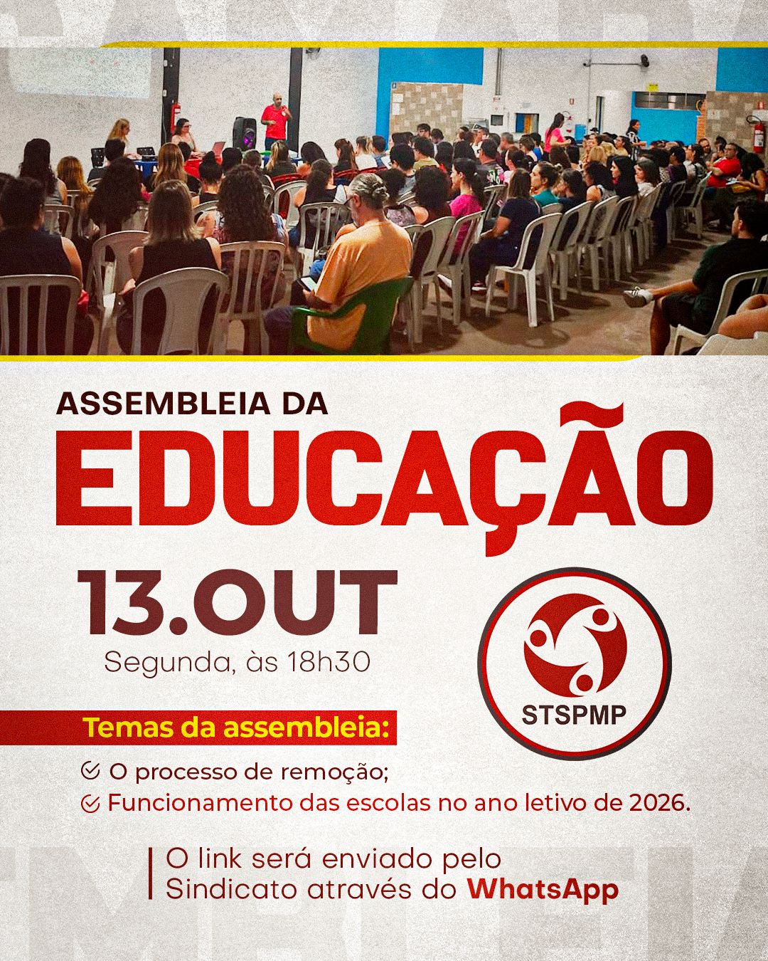 O Sindicato convoca todos os Servidores do Quadro do Magistério, Educadores Infantis e demais cargos da Secretaria de Educação para uma importante assembleia. O encontro será no dia 13 de outubro, de forma ONLINE, com primeira chamada às 16h30 e segunda convocação às 18h30. A pauta central tratará de dois temas de grande impacto para a categoria: o processo de remoção e o funcionamento das escolas no ano letivo de 2026.