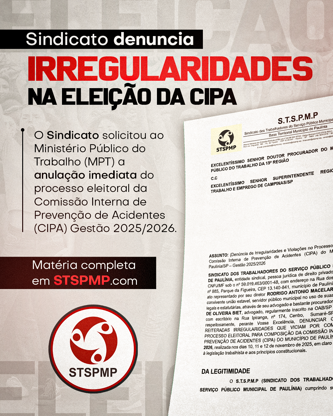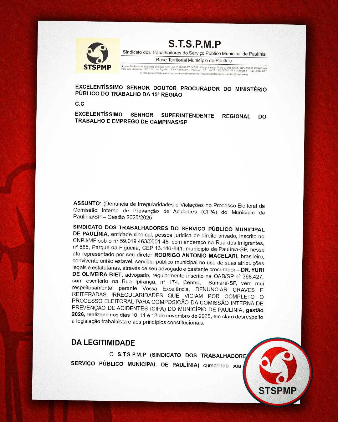 O Sindicato protocolou uma denúncia formal junto ao Ministério Público do Trabalho (MPT) solicitando a anulação imediata do processo eleitoral da Comissão Interna de Prevenção de Acidentes (CIPA) para a gestão 2025/2026, realizado entre os dias 10 e 12 de novembro. A medida foi tomada após a constatação de uma série de vícios que maculam a legitimidade do pleito, ferindo a Norma Regulamentadora nº 5 (NR-5) e os princípios constitucionais da Administração pública.