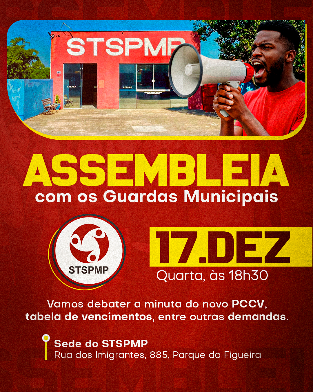 STSPMP convoca Guardas Civis para importante assembleia, dia 17 de dezembro, às 18h30. Marque na agenda e não falte!