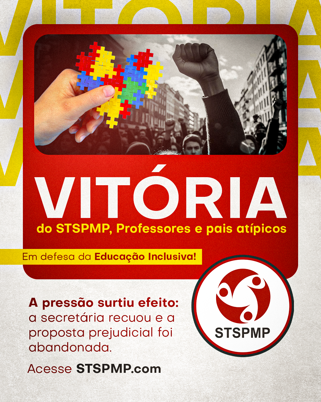 Após a mobilização promovida pelo STSPMP, com a firme participação de Professores, comunidade escolar e pais atípicos, conseguimos uma importante vitória para a Educação Inclusiva. A senhora Márcia Scarassati, secretária de Educação, havia anunciado a possibilidade de substituir os Professores de apoio com formação em Pedagogia por estagiários sem formação adequada. Essa medida, que representaria um grave retrocesso no atendimento aos alunos, foi barrada devido a força da mobilização coletiva.